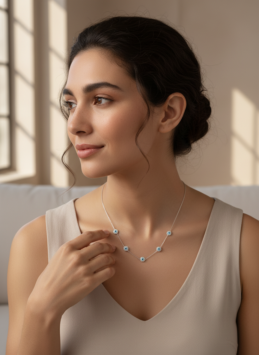 92.5 Silver Rhodium Plated Evil Eye Bluestone Fortune Necklace | With Certificate of Purity & Hallmark Designed to reflect refined elegance, this jewellery piece features a sophisticated Evil Eye Bluestone Fortune design crafted in premium 92.5. It blends timeless appeal with modern sensibilities for effortless styling.